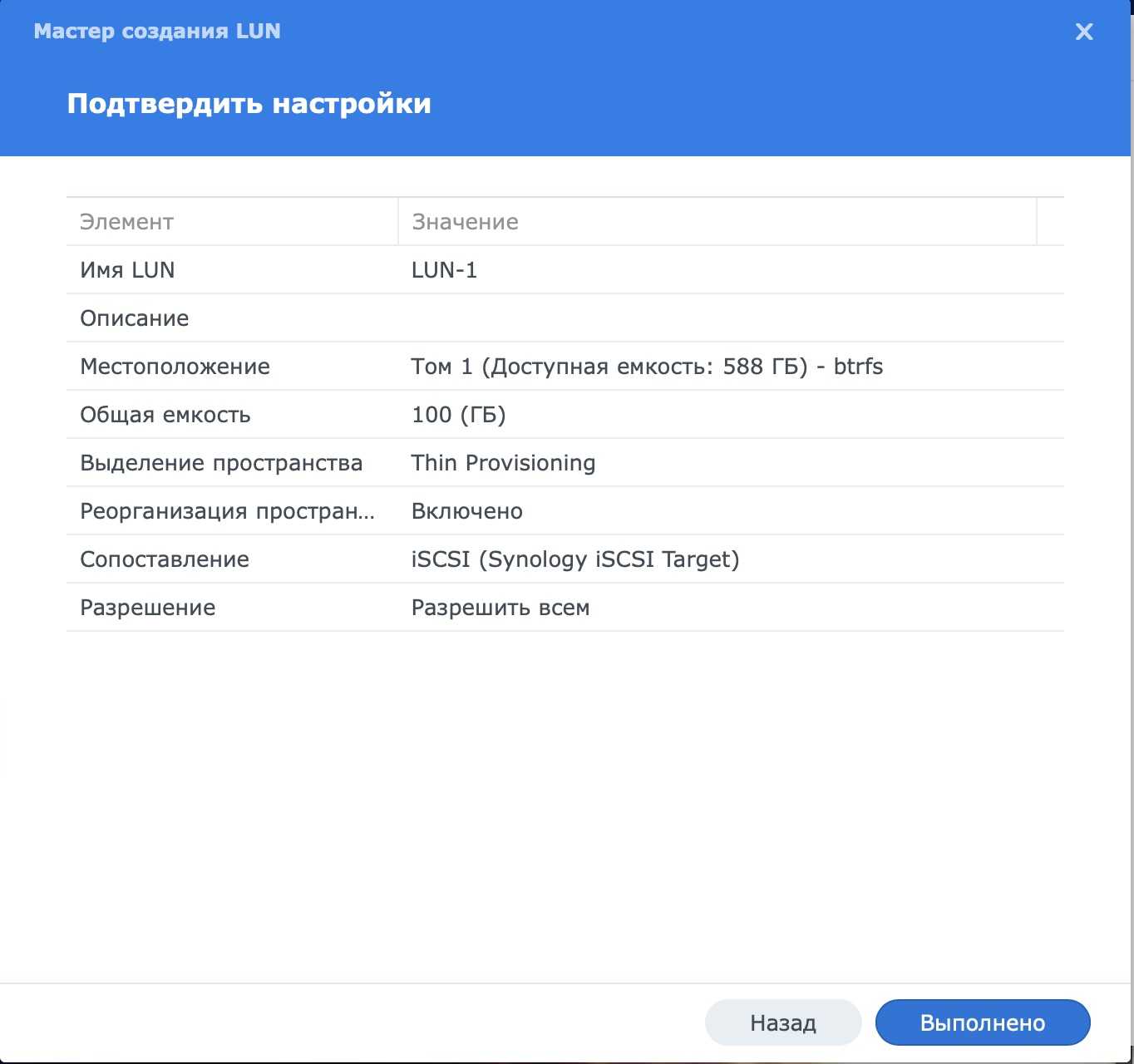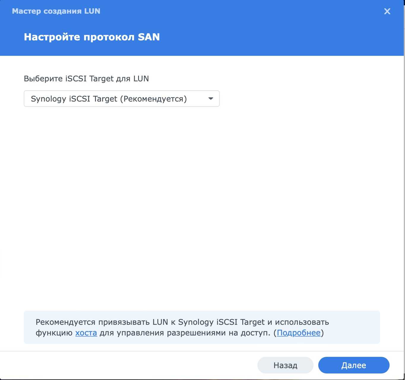 На следующем этапе система порекомендует сразу создать для этого LUN интерфейс iSCSI что я и рекомендую сделать. Тут нужно отметить, что к одному интерфейсу iSCSI можно прикрепить 1 и более дисков LUN.