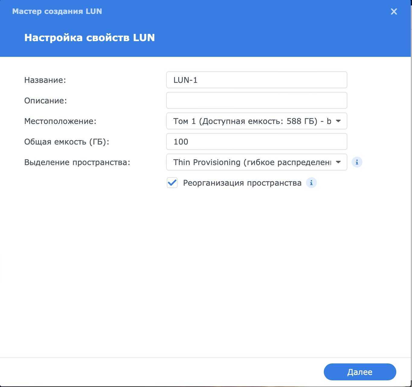 При создании LUN нам нужно выбрать название, добавить описание, место расположение и размер диска LUN. А вот выделение пространства интересная опция.
