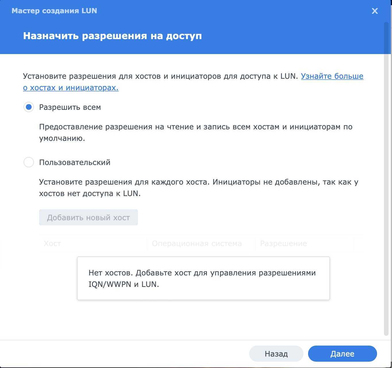 Дальше можно перейти обратно в NAS, в раздел хосты и добавить новый хост. Это только для безопасности. Можно это не делать. Просто этим способом можно ограничить подключение хоста к LUN