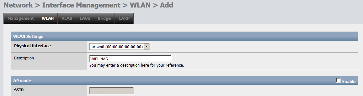 2) Идём в Network > Interface Management > WLANи добавляем новый WiFi интерфейс (серый + справа)