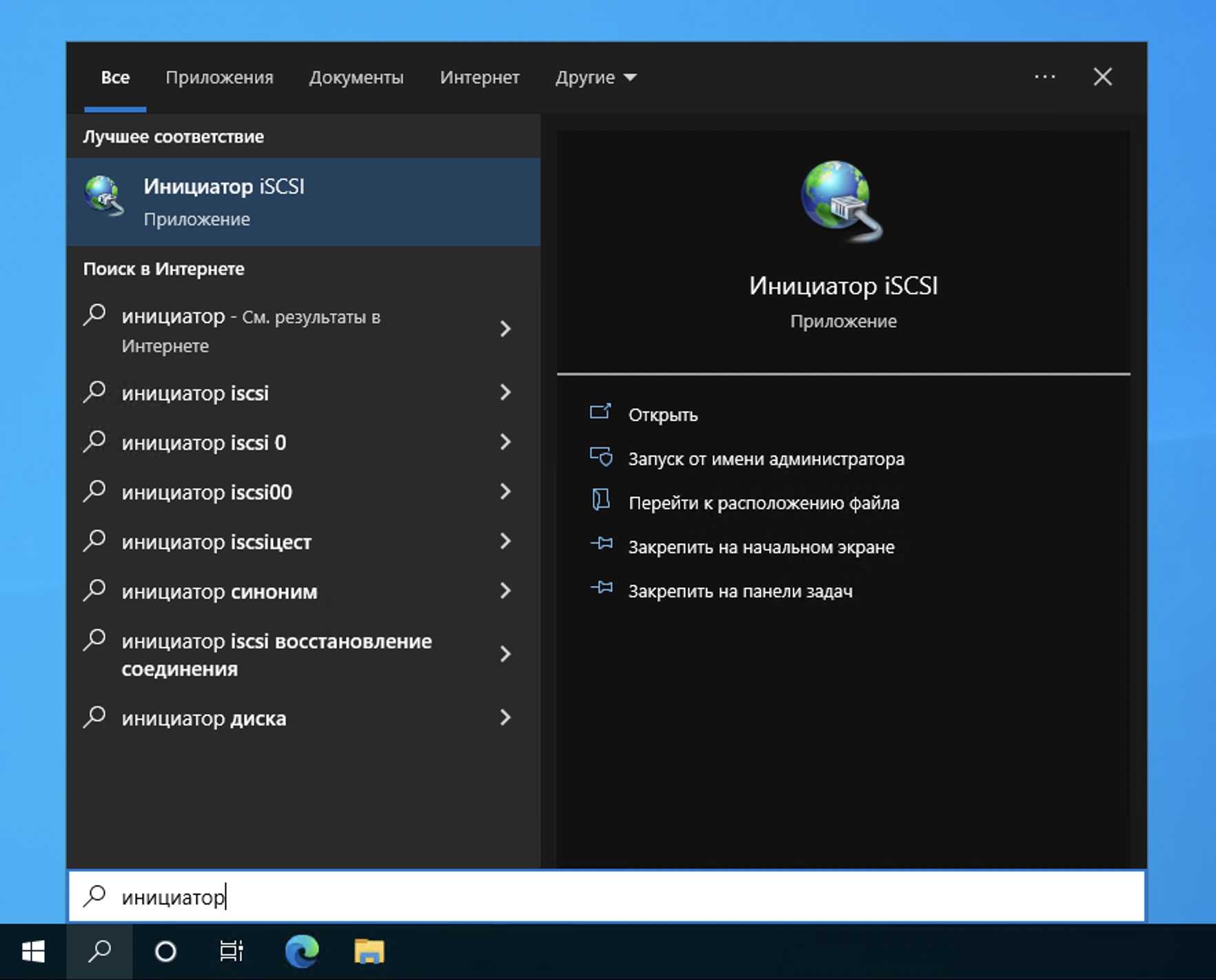 В поиске находим “Инициатор iSCSI” и запускаем его