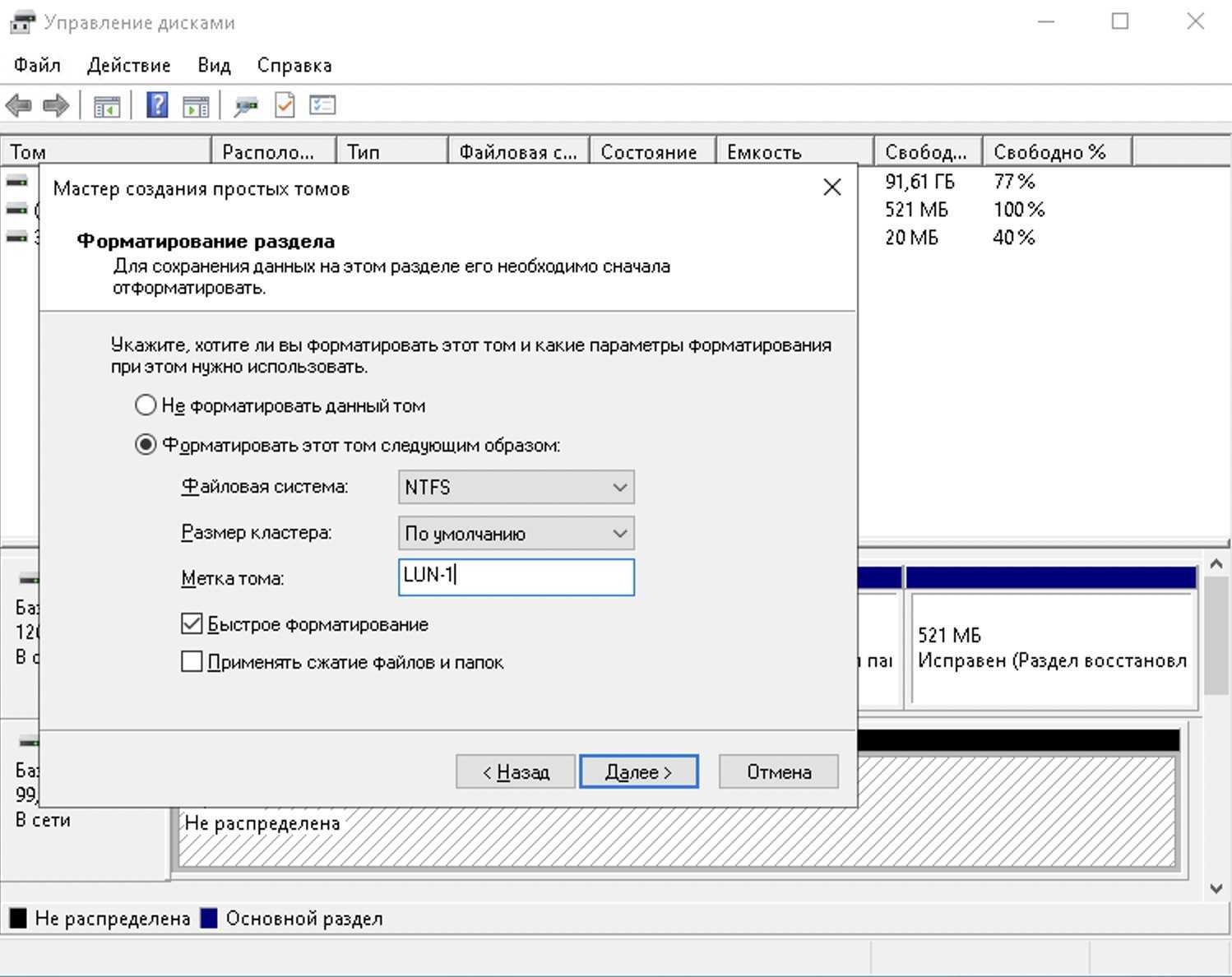 Мастер создания тома проведет нас по разным вопросам, но самый интересный это выбор форматирования диска. Тут можно выбрать любые нужные вам параметры.