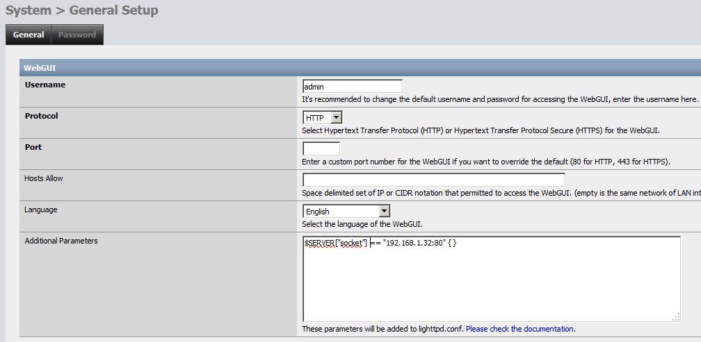 А вот в вебгуй не пустит, тут нужна отдельная настройка.Идём в System > General SetupИ в WebGUI Additional Parameters добавляем строкуЕстественно, адрес указываем тот, что выбрали ранее для второго интерфейса