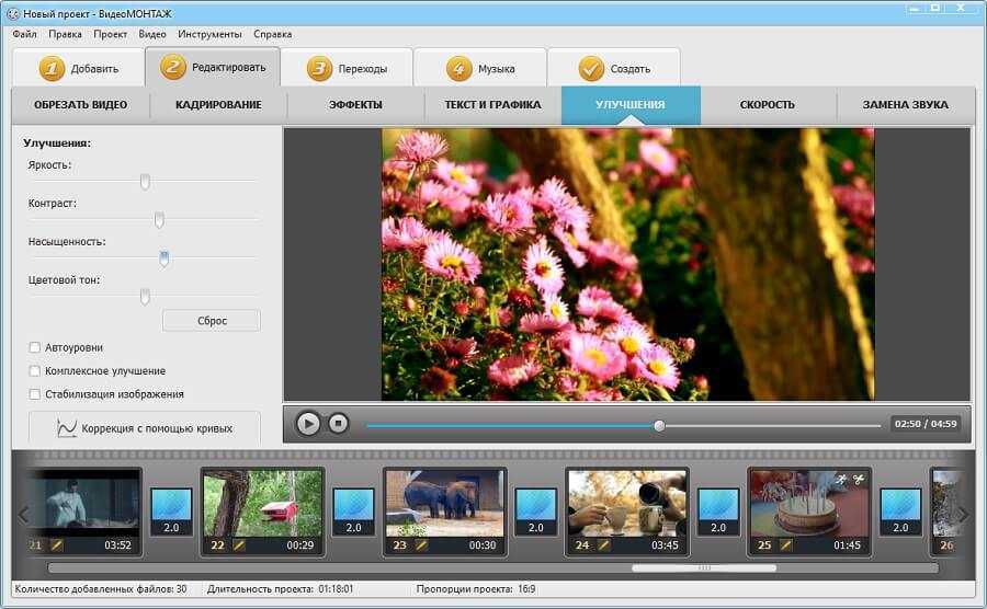 Улучшение качества. Программное обеспечение предлагает комплексный подход для улучшения картинки. Доступно повышение качества через настройку яркости, контрастности, насыщенности и цветового тона. Также проводится тонкая цветокоррекция с помощью кривых, устраняющая затемненные и пересвеченные кадры. Фильтры помогут добиться эффекта «киношной» картинки.