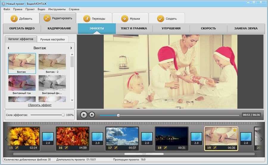 Эффекты. Универсальный видеоредактор содержит огромную коллекцию фильтров. Это стильные тонировки с добавлением отсветов, пленочного зерна, легкого шума и других элементов.