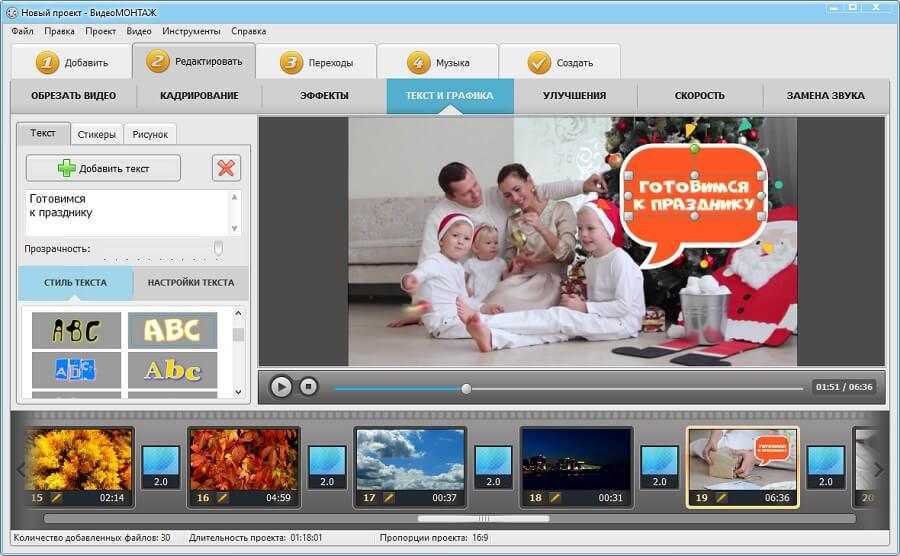 Текст + графика. Доступна обработка видеороликов от первого до последнего кадра. Софт позволяет дополнять видео собственноручно разработанными титрами и заставками: используйте готовый клипарт и фоны из коллекции ПО или подгружать файлы с ПК для создания дизайна с нуля.