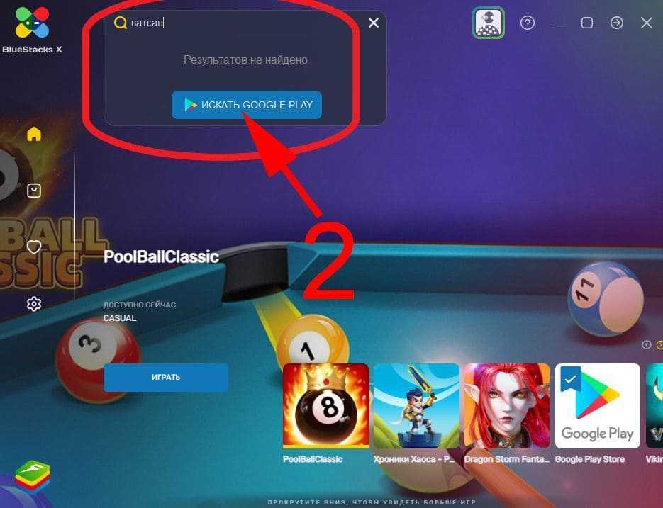 В результате откроется магазин приложений Play Маркет». Используйте функцию поиска в верхней части страницы, чтобы найти WhatsApp и скачать его на компьютер через эмулятор.