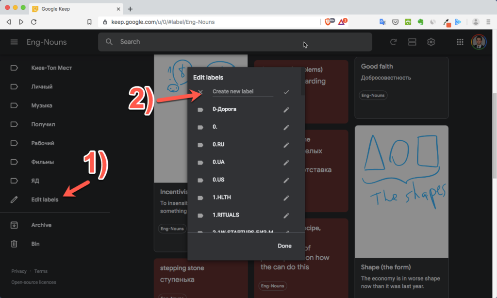 Чтобы создать метки 1) выберите Edit Lables слева внизу и после 2) укажите название меток