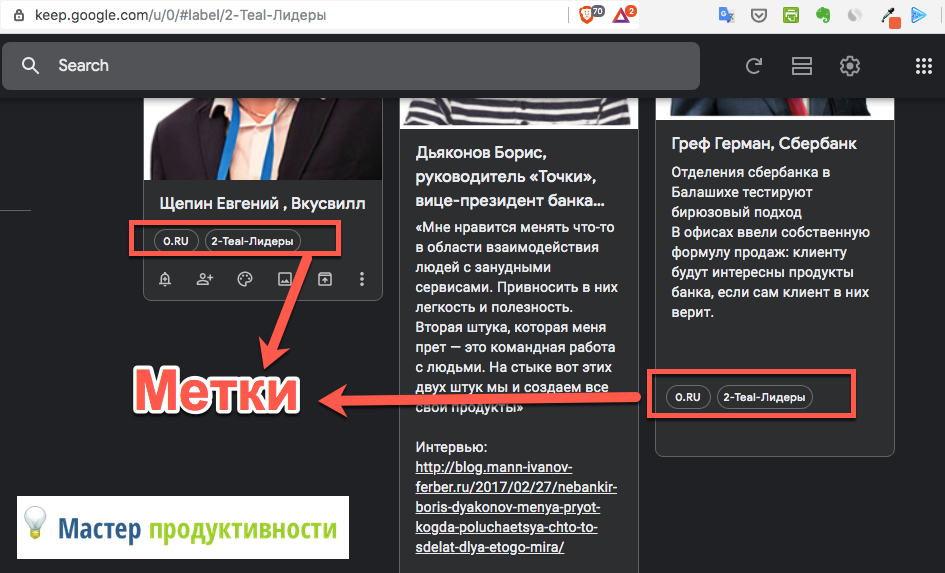 Довольно хорошая система лейбов и цветов. Я не очень их сейчас использую, потому что большинство заметок все-таки пока что Google Docs. Но если нужна была бы категоризация — то этого достаточно.