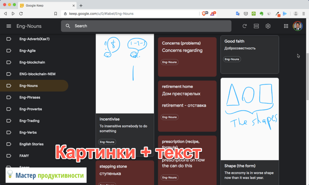 7. Рисунки + текст в одной заметке. Я использую Google Keep чтобы учить английские слова по методу карточек. И удобство его в том, что вместе с английским словом, я могу нарисовать от руки картинку что оно обозначает, так мой мозг лучше запомнит это слово.