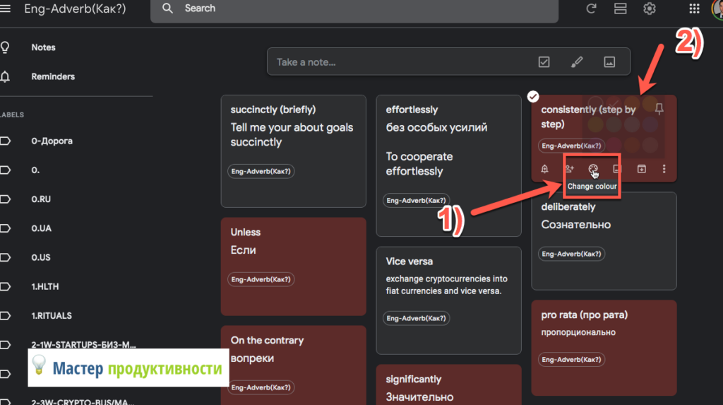 10. Выделяем заметки цветами. Эту фишку я использую для выделения особенно важных английских слов, которые нужно запомнить