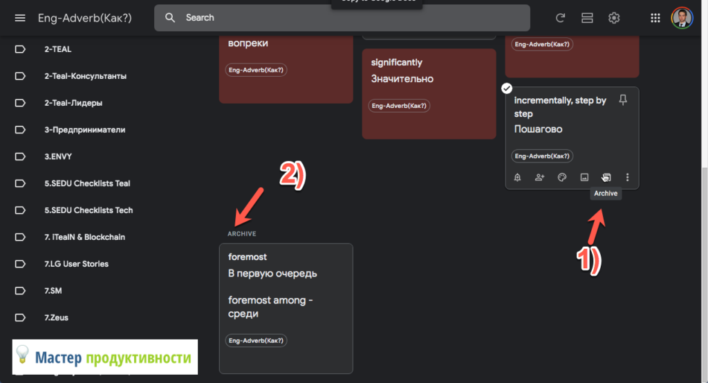 11. Архивирование вместо удаления. Карточки которые устарели – отправляйте в архив, вместо удаления. У Google хватает памяти чтобы не удалять информацию а архивировать, и потом находить если она понадобится вам в будущем.