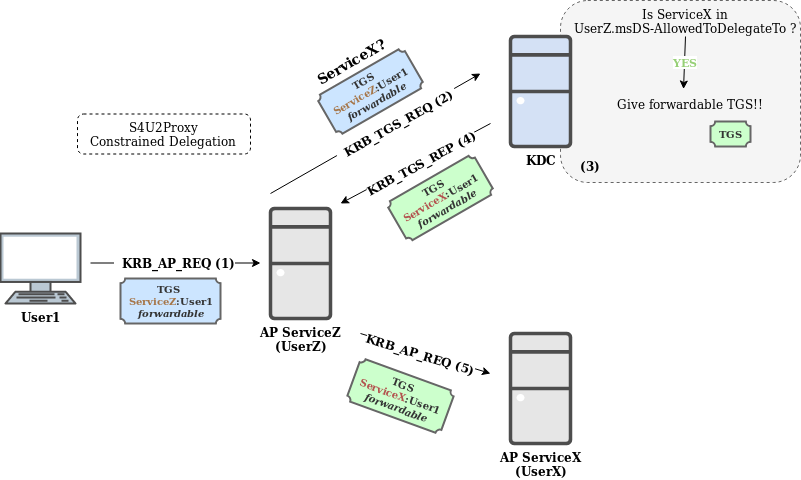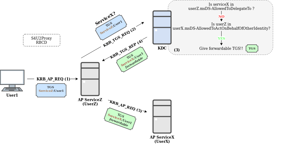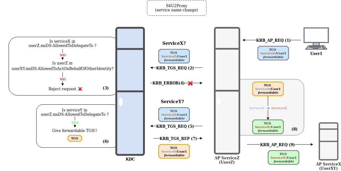 - ServiceZ, owned by UserZ, uses this TGS to ask the KDC for a TGS for ServiceX on behalf of User1.