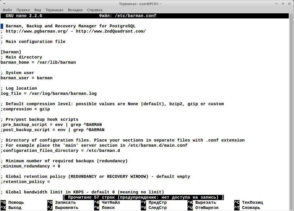 Barman написан на Python, управление политиками резервного копирования производится при помощи понятного INI-файла barman.conf, который может находиться в /etc или домашнем каталоге пользователя. В поставке идет готовый шаблон с подробными комментариями внутри. Работает только на *nix-системах. Для установки в RHEL, CentOS и Scientific Linux следует подключить EPEL — репозиторий, в котором содержатся дополнительные пакеты. В распоряжении пользователей Debian/Ubuntu официальный репозиторий:
