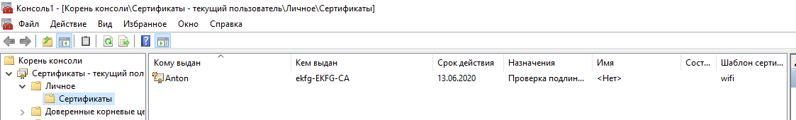Далее перейти в личное хранилище сертификатов, на скрине ниже видно что сертификат выдан на пользователя «Anton» и был использован шаблон «wifi»