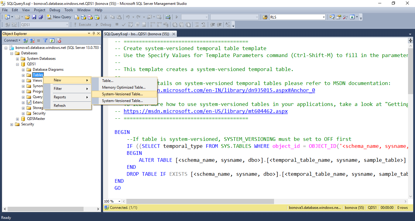 Используйте пункт контекстного меню «New System-Versioned Table» (Новая таблица с системным управлением версиями) в обозревателе объектов SSMS, чтобы открыть редактор запросов с шаблоном сценария временной таблицы, а затем щелкните «Указать значения для параметров шаблона» (Ctrl+Shift+M) для заполнения шаблона: