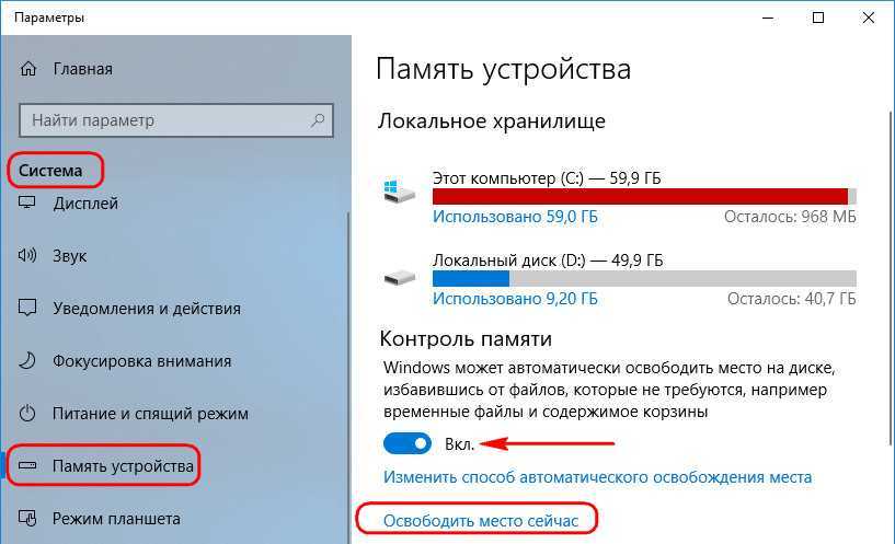 Очистить диск С от ненужных файлов в Windows 10 можно с помощью специальной функции, которая появилась именно в последней версии операционной системы. Называется она «Контроль памяти».