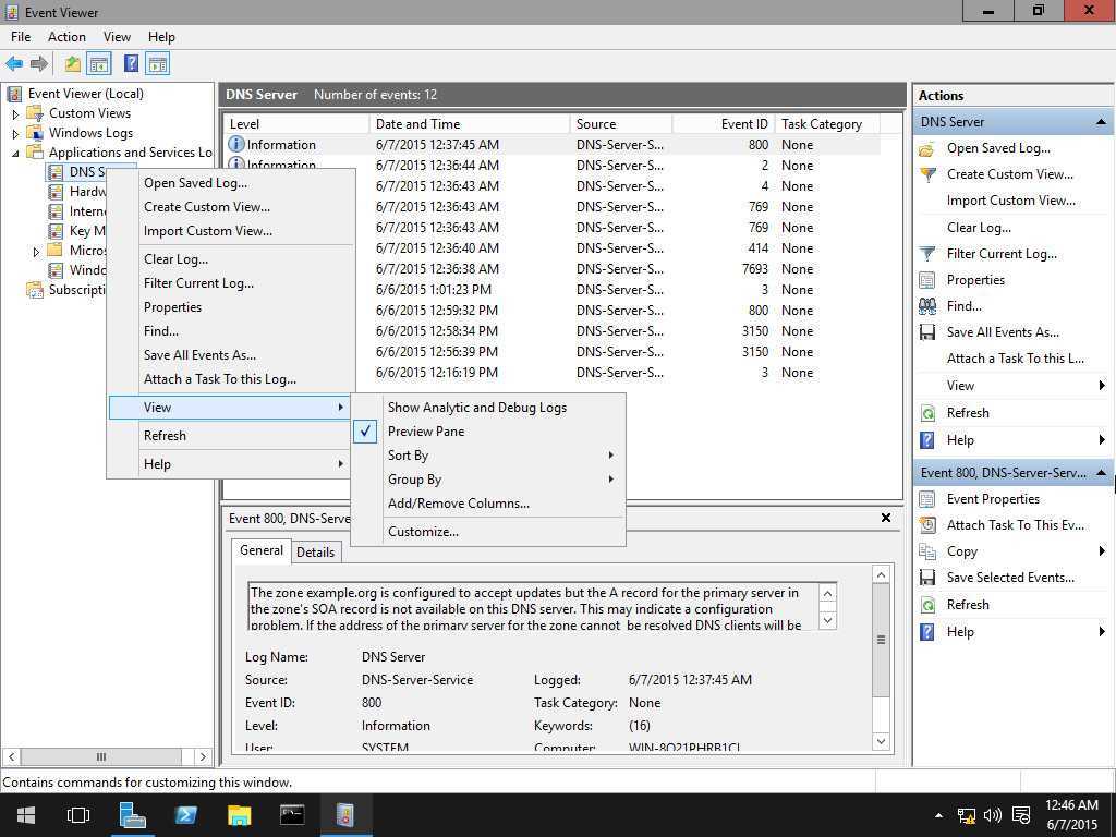 Для DNS-сервера появилась возможность записи событий аудита и аналитики в журнал событий. По умолчанию она отключена, но активировать ее можно в Event Viewer: в разделе Application and Services Logs находим DNS-Server и в контекстном меню View отмечаем Show Analytic and Debug Logs. Журналы DNS совместимы с клиентскими Event Tracing for Windows (ETW) приложениями вроде LogMan, Tracelog, EtwDataViewer.