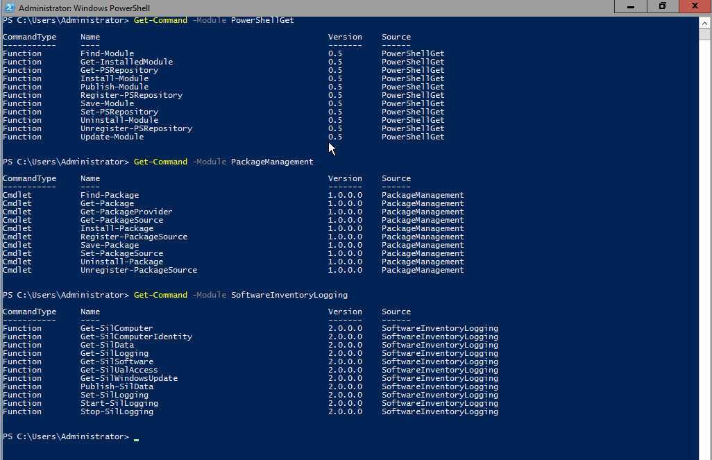 Теперь все это официально входит в комплект и используется PS. PackageManagement фактически еще одна фишка из мира *nix, позволяющая ставить программы из централизованного репозитория одной командой. Это упрощает поиск ПО, его обновление и безопасность системы. Можно работать с несколькими репозиториями и создавать свои. Набор командлетов получаем командой