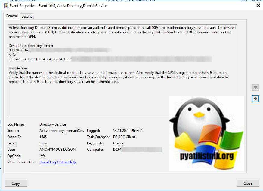Destination directory server: d06896a3-be4b-4b8a-b75f-e3453457526a0f._msdcs.pyatilistnik.org SPN: E3514235-4B06-11D1-AB04-00C04FC2DCD2/d06896a3-be4b-4b8a-b3453453526a0f/pyatilistnik.org