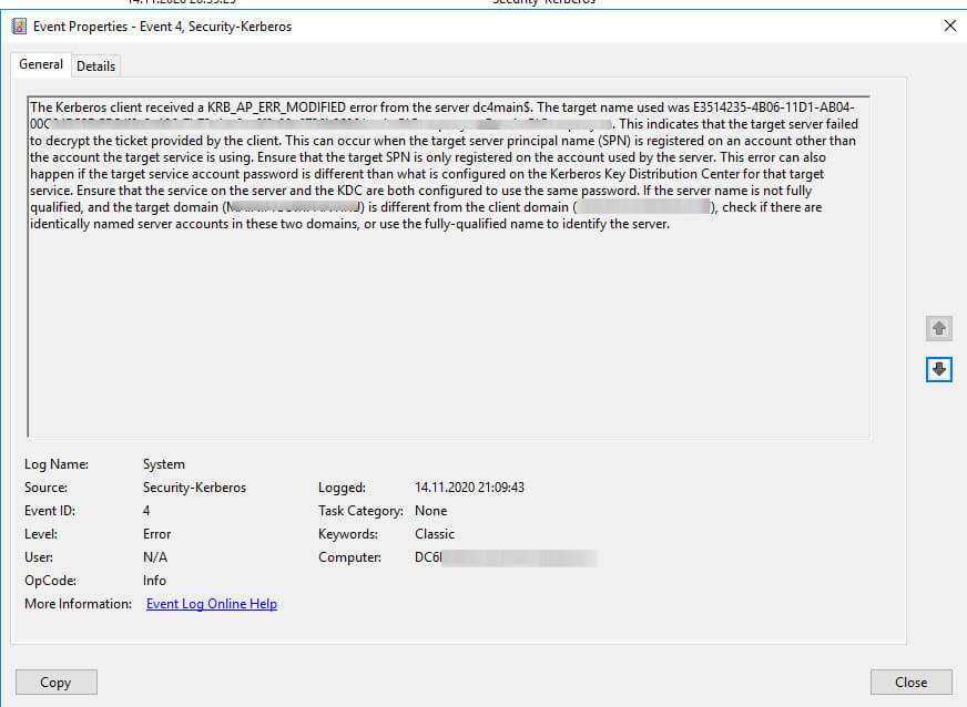 Ошибка ID 4: The Kerberos client received a KRB_AP_ERR_MODIFIED error from the server dc4main$. The target name used was E3514235-00000-0000-AB04-00C04FC4534D2/f0e3a106-7b73-4ce0-a6f2-09c673454356/домен. This indicates that the target server failed to decrypt the ticket provided by the client. This can occur when the target server principal name (SPN) is registered on an account other than the account the target service is using. Ensure that the target SPN is only registered on the account used by the server. This error can also happen if the target service account password is different than what is configured on the Kerberos Key Distribution Center for that target service. Ensure that the service on the server and the KDC are both configured to use the same password. If the server name is not fully qualified, and the target domain (root.pyatilistnik.org) is different from the client domain (root.pyatilistnik.org), check if there are identically named server accounts in these two domains, or use the fully-qualified name to identify the server.