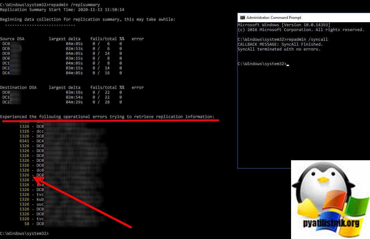 При выполнении команды вы получите сообщение о том, что конечный контроллер домена под управлением Windows Server 2008 или Windows Server 2003 не может реплицировать входящие изменения в раздел каталога с одного или нескольких исходных контроллеров домена. В этом случае также возникает ошибка Win32 8451.