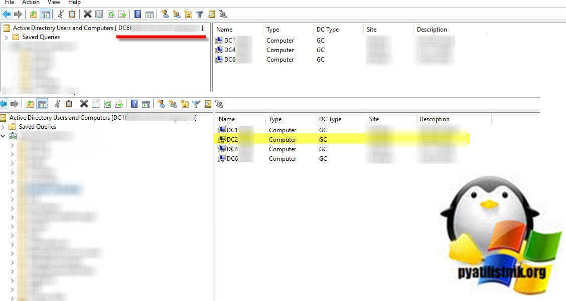 Откройте оснастку «Пользователи и компьютеры Active Directory». В домене удаленного контроллера домена щелкните контроллеры домена. В области сведений не должен отображаться объект для удаляемого контроллера домена.