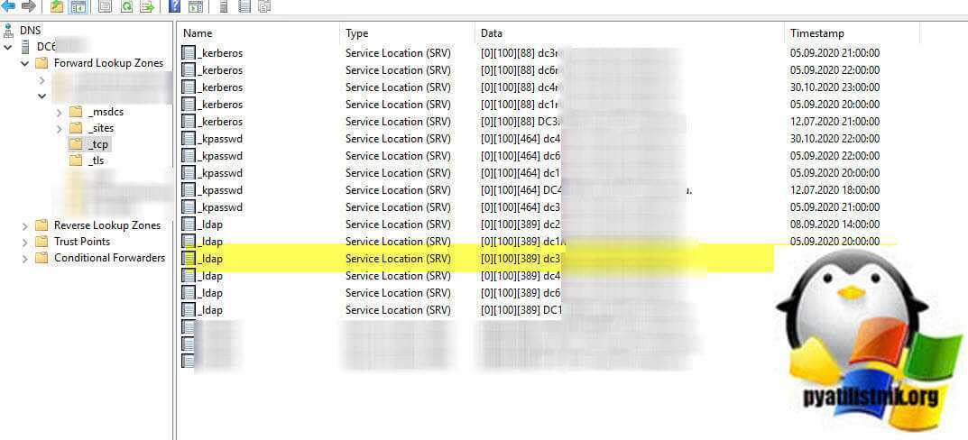 Далее я естественно заглянул и в оснастку DNS, где мне нужно было удостовериться, в наличии или отсутствии сервисных записей нового контроллера и старого. Я оказался прав, присутствовали записи старого контроллера. Записи SOA, так же сильно отличались.