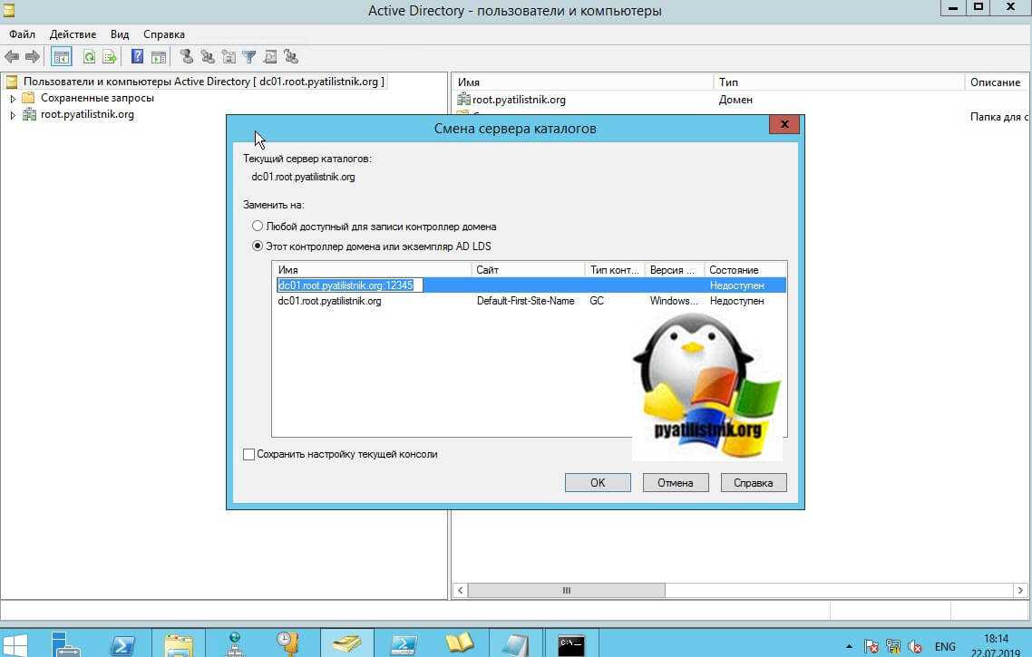 Выбираем пункт «Этот контроллер или экземпляр AD LDS», за место поля «Введите здесь имя  сервера» вводим имя вашего контроллера, где смонтирован снимок и прописываем порт, в моем примере dc01.root.pyatilistnik.org:12345.