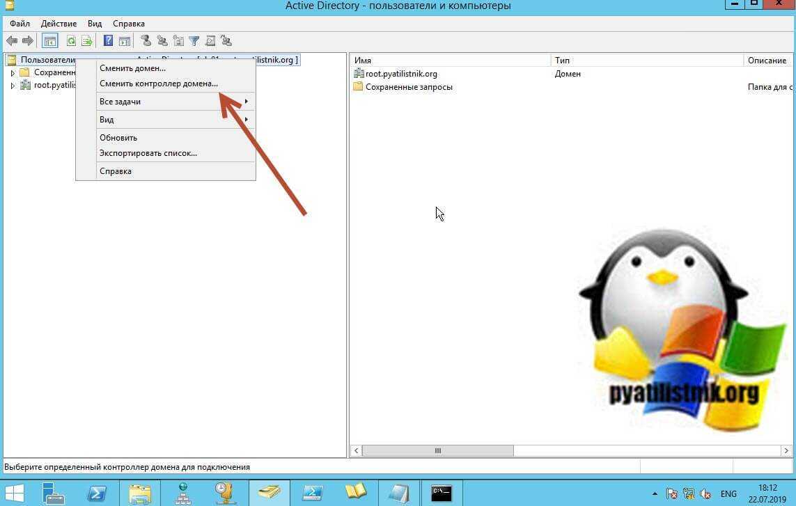 теперь откройте оснастку «Active Directory Пользователи и компьютеры», щелкаем в корне правым кликом и выбираем пункт «Сменить контроллер домена».