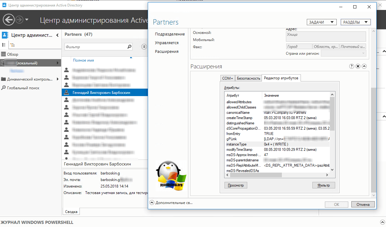 Открываем его свойства, переходим на вкладку «Расширения» и перед вами будет, знакомый редактор атрибутов AD. Вот так вот его запрятали. Хочу отметить, что начиная с Windows Server 2012 R2, компания Microsoft старается продвигать все работы с объектами Active Directory именно в этой утилите и оснастке power shell и это понятно, у последнего возможностей в разы больше, чем у GUI собратьев. Поэтому, кто еще пока с ним не знаком, будет очень полезно начать именно с оснастки «Центр администрирования Active Directory», которая имеет подсказки, как все сделать через оболочку power shell.