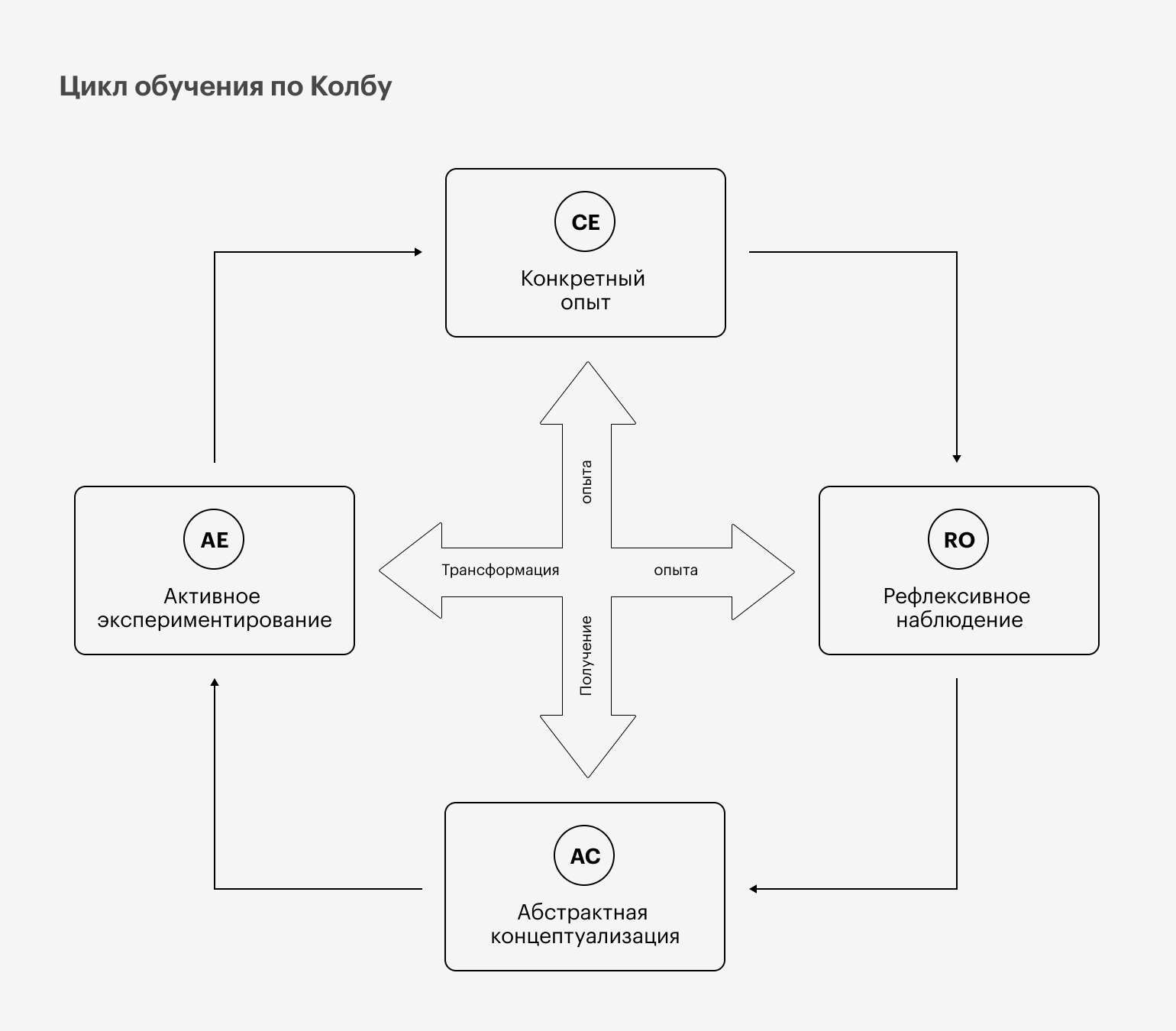 Колб описал трансформацию опыта при обучении через цикл из проб и ошибок и выделил в этом процессе четыре этапа: