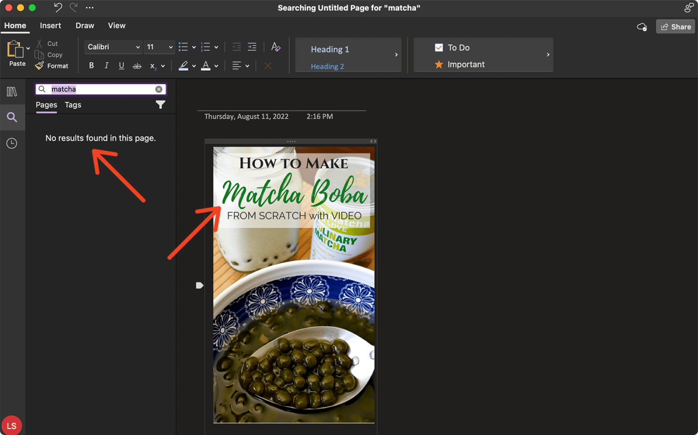 In contrast, OneNote was unable to identify the word «matcha» in the same image (shown below). I tried to search for «scratch,» another word in the image that uses a simpler font, and OneNote was still unable to find the word in the image.
