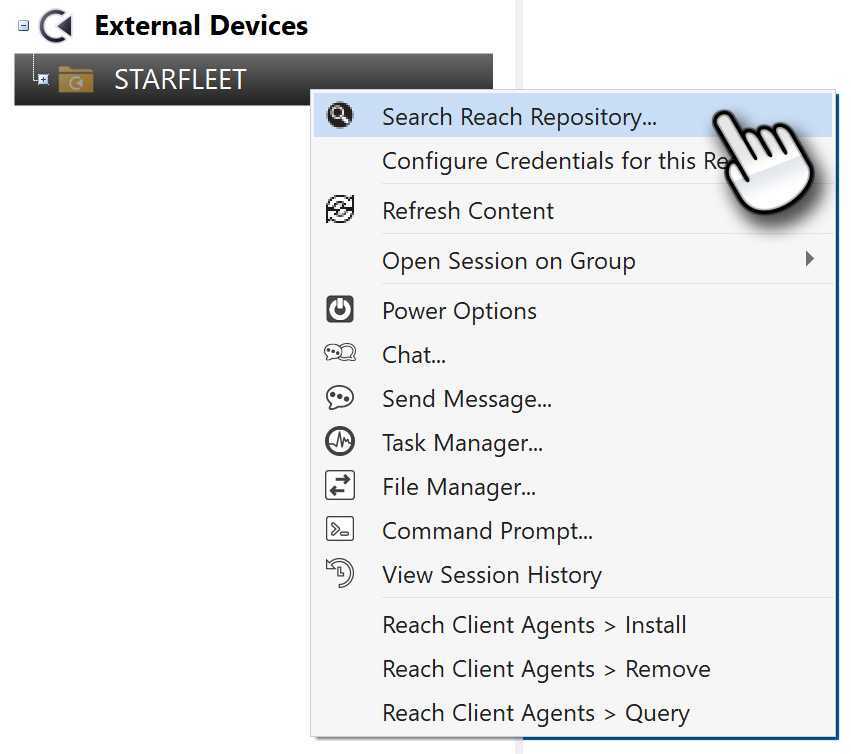 For instance, enter REACH: SOME-OUTMAC-001* and a search for SOME-OUTMAC-001 will be initiated, irrespective of its location within the External Devices Area.