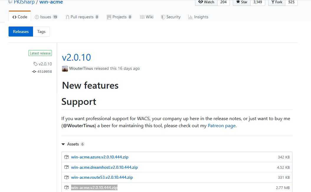 Скачайте последний релиз клиента WACS со страницы проекта на GitHub https://github.com/PKISharp/win-acme/releases (в моем случае это версия v2.0.10 – файл win-acme.v2.0.10.444.zip).
