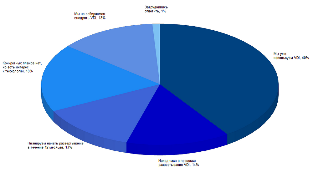 Неудивительно, что 40% компаний, в которых работают респонденты, уже используют виртуальные рабочие столы, а еще 46% — находятся на различных этапах рассмотрения или выбора соответствующего решения.