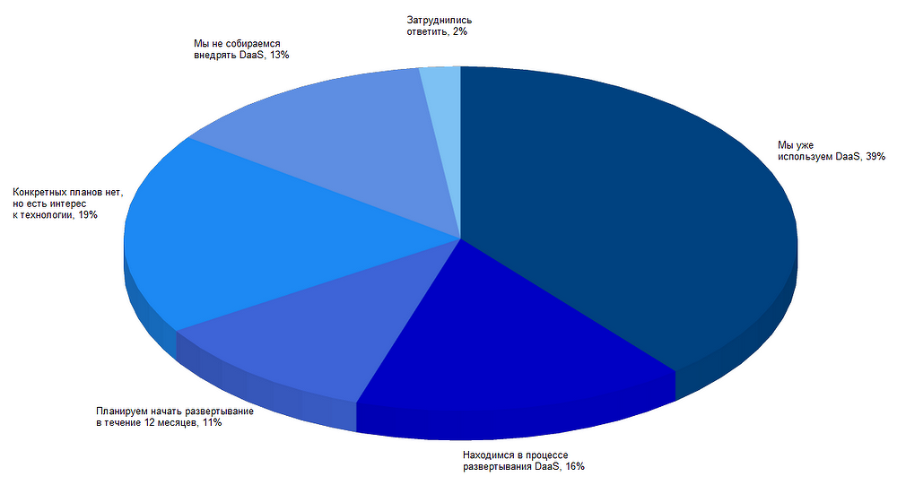 Аналогично растет популярность и более молодой модели DaaS. По данным Enterprise Strategy Group структура намерений респондентов относительно ее внедрения почти совпадает с таковой у VDI. То же почти у 40% активных пользователей, 27% — на различных стадиях внедрения и 13% отказавшихся.