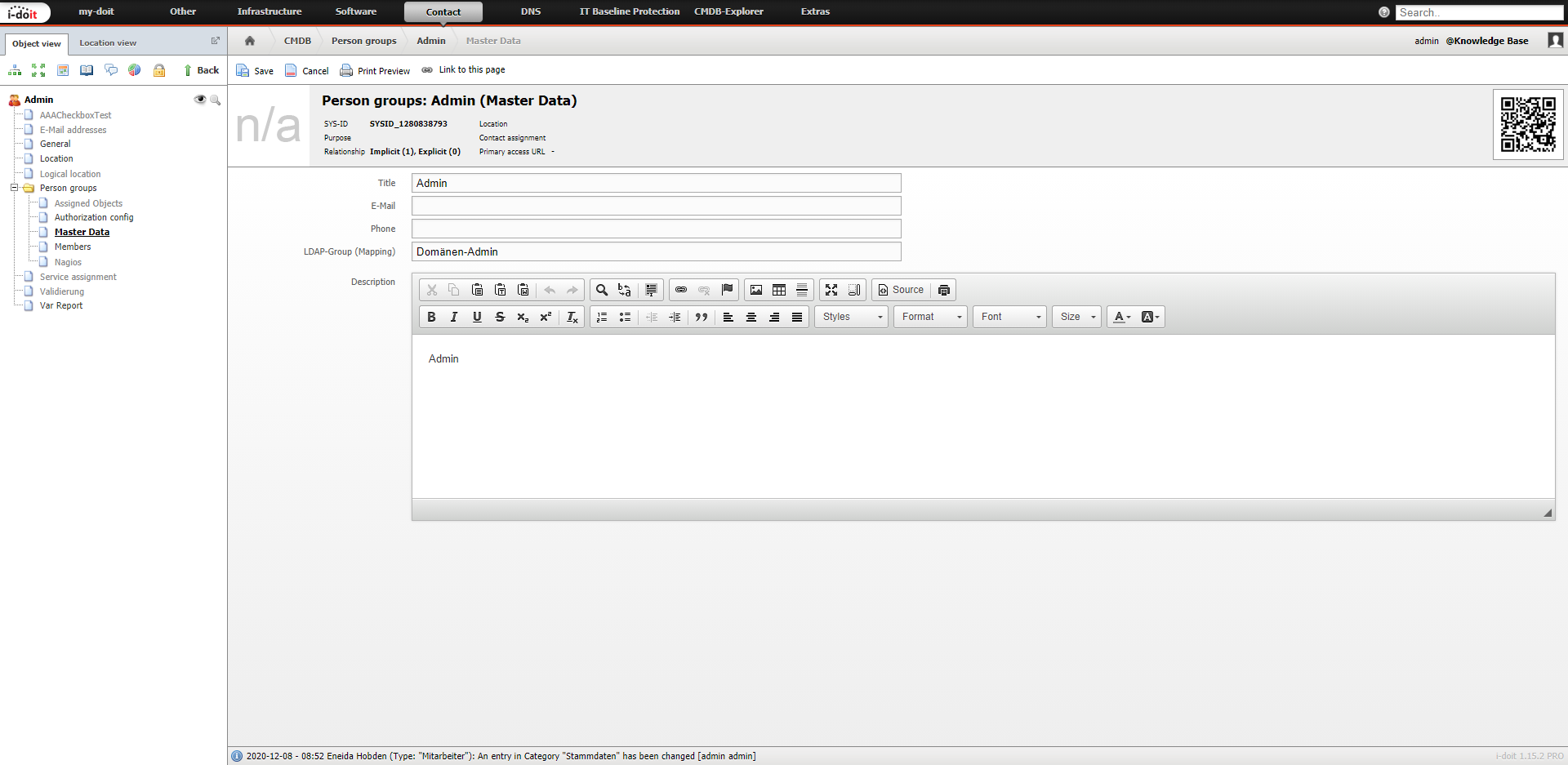 The automated assignment makes sure that the specified permissions of the person group are assigned automatically upon log in. The attribute in the of a has to be filled with a valid group from your directory in order for the assignment to happen. The groups assigned to the user object in the directory are queried and compared to the attribute of the i-doit person groups once a user is logging in or the synchronization is initiated. If there is a match, the group is assigned and the other groups are queried.