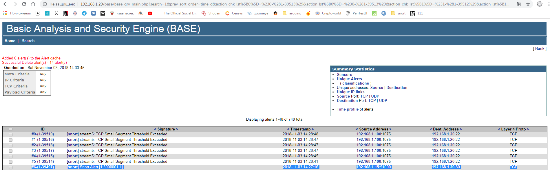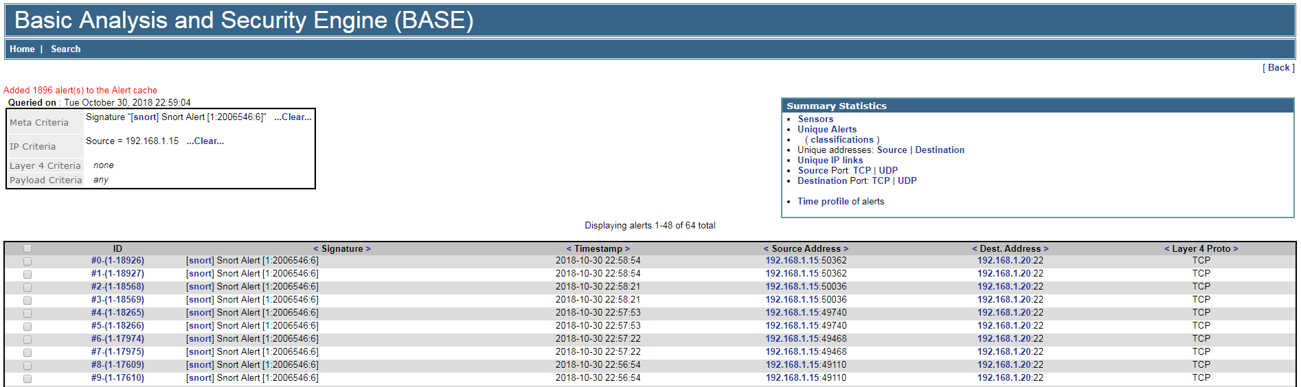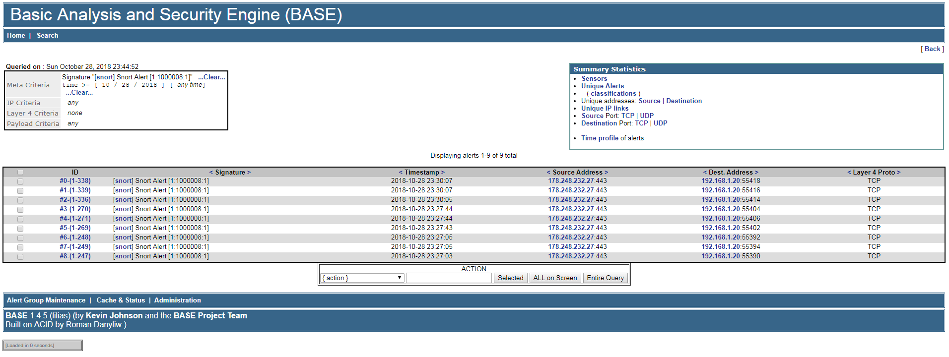 Через 15–30 секунд наш BASE перестает отвечать. И даже после остановки атаки пришлось перезапустить веб-сервер. Сам он за короткий промежуток времени не смог подняться. Упал только BASE. Snort, естественно, продолжал работать и записывать оповещения в базу.