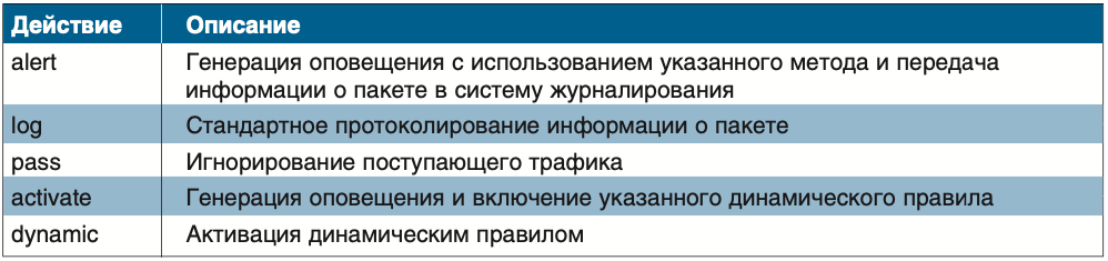 Заголовок правила должен содержать так называемое ключевое слово, определяющее действие, которое выполняется при совпадении всех заданных условий. Основные действия правил представлены в табл. 2.