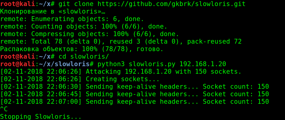 Давай пойдем чуть дальше. Поднимаем Kali Linux и пробуем провести DoS-атаку на наш Apache. Так как BASE работает по HTTP, самый легкий способ его «положить», как по мне, — это атака Slowloris. Поэтому скачиваем на нашу Kali соответствующий скрипт и запускаем атаку.