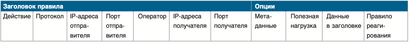 Правила состоят также из заголовка и опций. Заголовок включает в себя действие, протокол передачи, IP-адрес, а также сетевые маски и порты. Опции же включают в себя дополнительные критерии обработки правил и реагирующих действий. Данные параметры применяются для описания фильтрации сетевого трафика. Общая структура правил представлена в табл. 1.