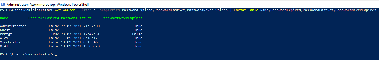 Теперь в пользовательских данных есть информация о статусе учётной записи (Истёк ли срок действия пароля: True/False), дате последней смены пароля и времени последнего входа пользователя в домен. Чтобы отобразить эту информацию в более удобном табличном виде и удалить все ненужные атрибуты, используйте Select-Object -Property или Format-Table: