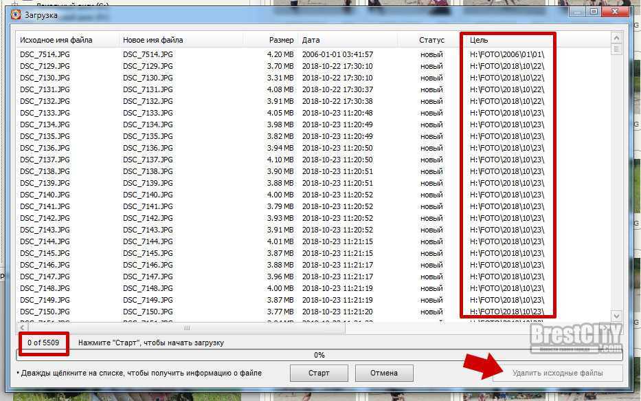 Но прежде, чем начнется копирование появится еще одно «проверочное» окно. Здесь вы увидите общее количество файлов, какие создаются папки, старые и новые имена файлов (если вы ставили галочку их переименовать). По окончании копирования можно нажать на кнопку «Удалить исходные файлы» (но лучше не спешить, а все перепроверить).