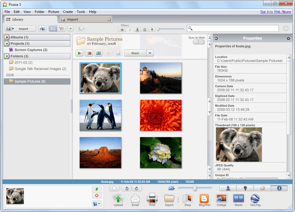 Есть и такие удобные функции, как распознавание лиц и гео-тэггинг. Вы сможете просканировать все фотографии и затем искать в базе конкретных людей. А гео-тэггинг позволит искать по месту съемки. Отдельного внимания заслуживает просмотр фотографий — удобный интерфейс и дополнительные инструменты для редактирования заслуживают того, чтобы сделать Picasa просмотрщиком по умолчанию.