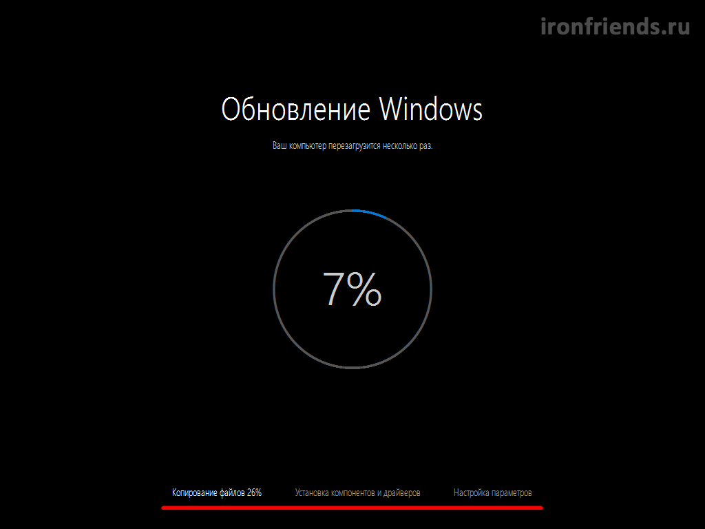 В круге отображается общий прогресс обновления, а в нижней строке текущий этап.