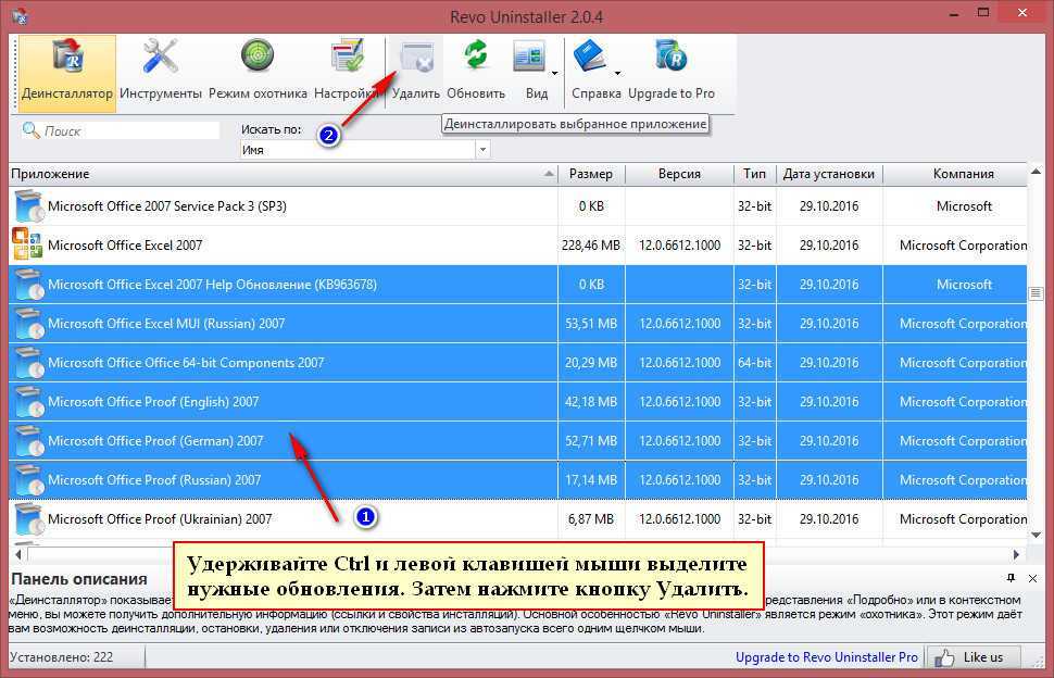 Для деинсталляции удерживайте нажатой клавишу Ctrl и выделяйте левой кнопкой мыши нужные обновления, затем кликните на иконку Удалить.