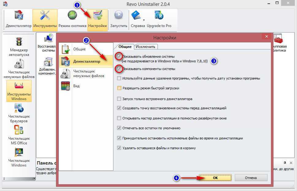 Запустите Revo Uninstaller и войдите в Настройки. В этом разделе выберите вкладку Деинсталлятор и поставьте галочки напротив параметров Показывать обновления системы и Показывать компоненты системы.