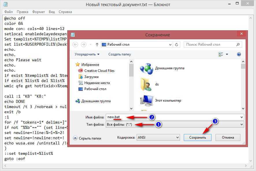 Сохраните созданный файл с расширением .bat, задав ему любое имя (например: new.bat). Предварительно в опции Тип файла выберите вариант Все файлы. Затем запустите батник.
