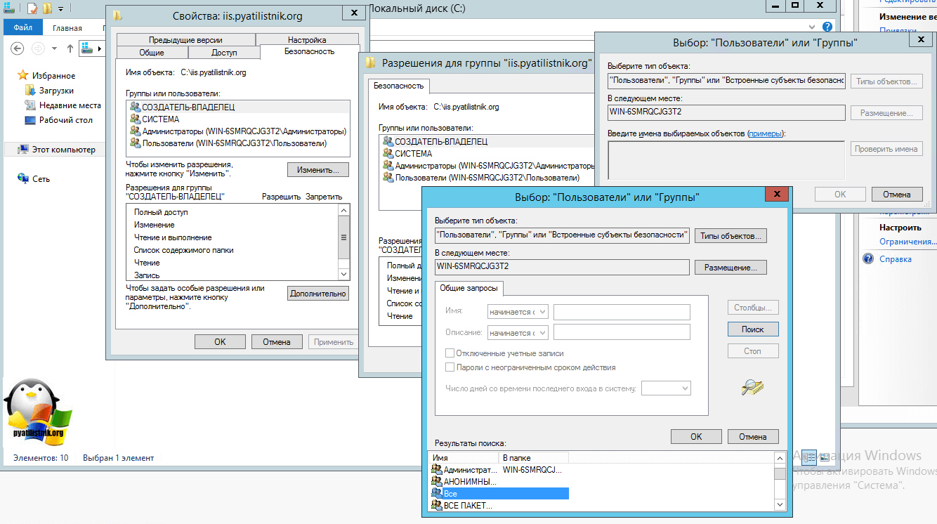 С первым вариантом, все понятно, кладем в папку нужный контент, во втором случае, вам нужно назначить права, я дам их для группы «Все» на чтение. Делается это просто, выберите папку и щелкните по ней правым кликом, выберите свойства.